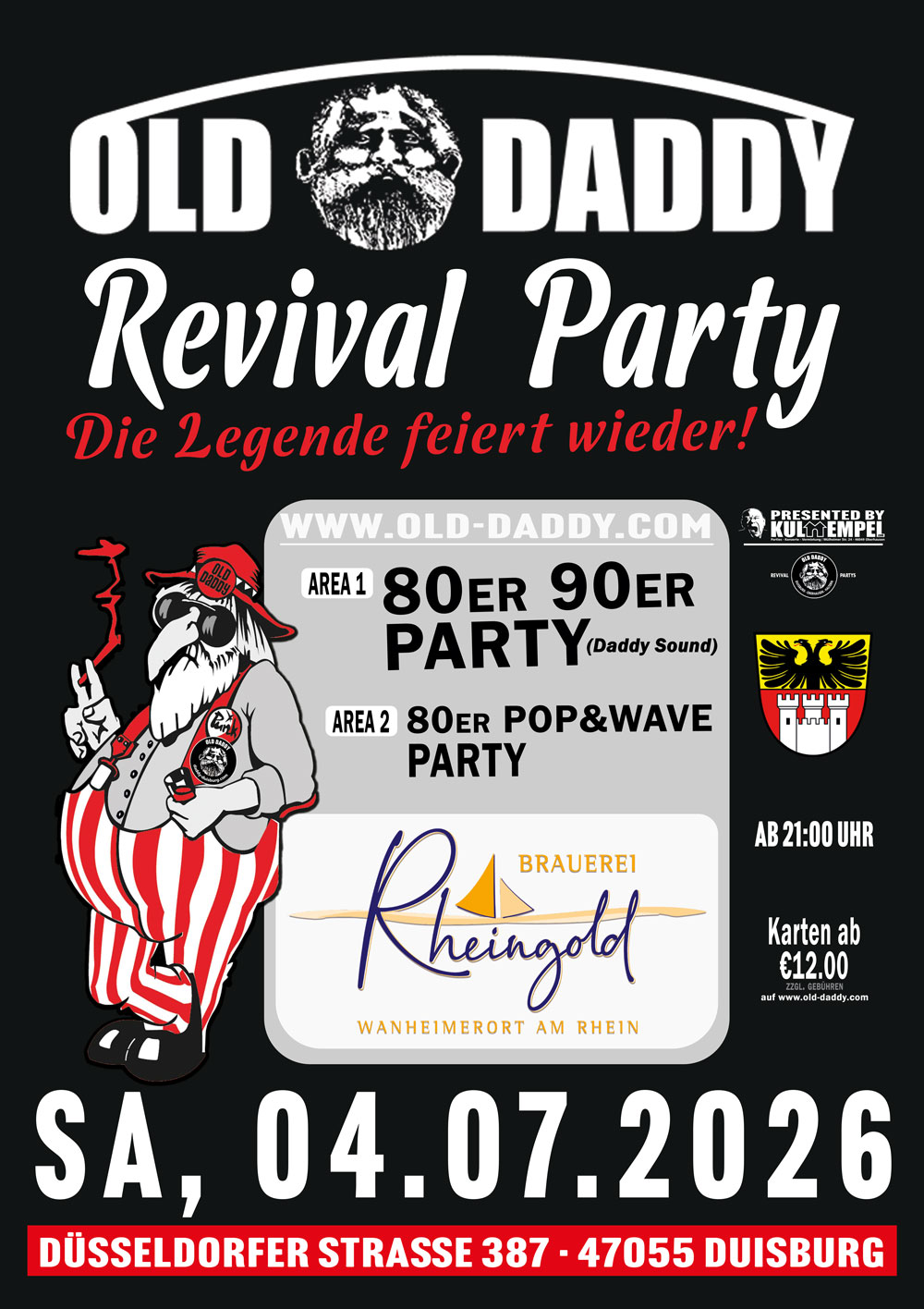 Die nächste Runde findet am 04.Juli 2026 statt und dann gibt es erneut eine Old Daddy Duisburg Revival Party in der Rheingold Brauerei an der Düsseldorfer Straße 387 in 47055 Duisburg. Um geanuer zu sein im Wanheimerort und das wieder auf zwei Floors, um ausgelassen mit euch zu feiern. Ja, genau, zwei Floors. Den Saal und eine zweite Halle, die wieder mit unserer Licht- und Tonanlage bestückem werden, damit eure zu Recht hohen Ansprüche voll erfüllt werden.